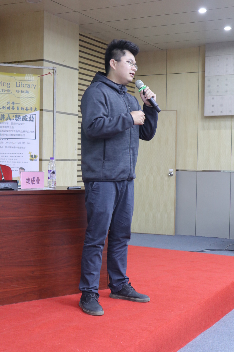 12月15日晚上,“真传奇珍秘笈”第一期“真人图书”分享会在图书馆学术报告厅举行。本期活动由我校体育学院辅导员赖成业老师担任“真人图书”。图书馆馆长杨勇、文学与传媒学院党总支副书记黄伟、校团委詹秀红老师及图书馆宣传推广部的老师们出席了活动。