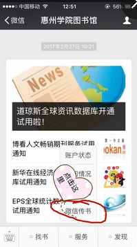 4.直接在公众号里面输入自己想借的书名,点开结果。有在架的书和可以微信传书的书,点击微信传书。
