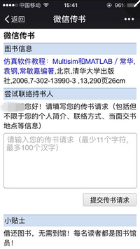 5.点开以后会让填写一个微信传书请求,书的拥有者可以收到这个请求。