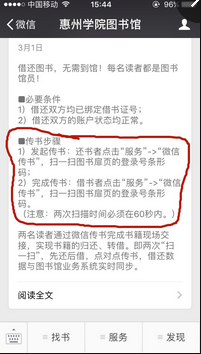 微信传书可以帮助借阅者通过公众号借阅其他借阅者已经借阅的图书,无需其他借阅者归还到图书馆,借阅者再去图书馆借阅。双方在线上约好时间地点,见面通过微信传书扫一扫借书码就可以转借图书。具体步骤如下: