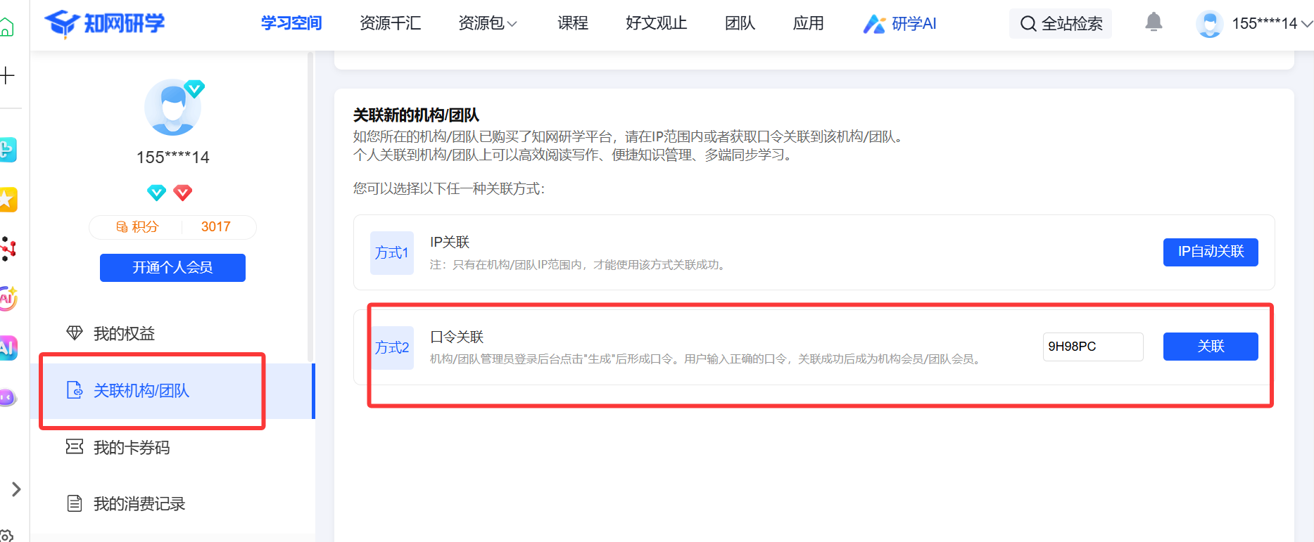 4.点击“关联机构/团队”,选择“关联机构/团队”,选择“口令关联”输入口令:9H98PC进行关联。